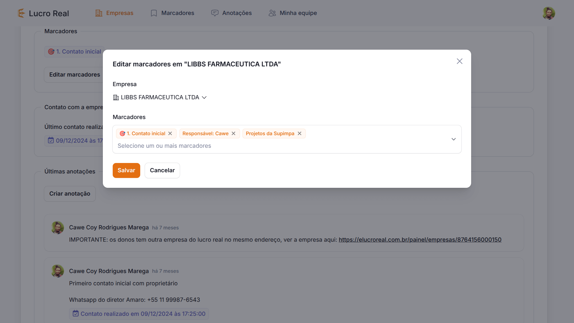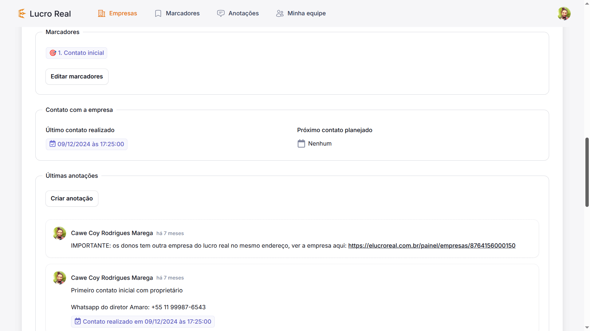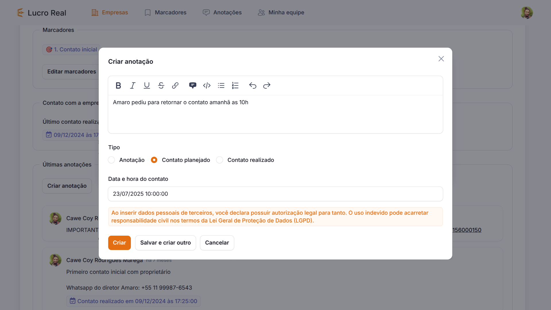 Registre o histórico de interações com as empresas e planeje as próximas ações.